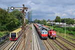 Ein allerletztes Mal Kaffeezug. Am 31.7.2025 fuhr der bekannte Kaffeezug in Berlin das letzte mal durch Neukölln. Dementsprechend wurde 298 331 geschmückt. Nach über 30 Jahren ist dieses Kapitel Geschichte. Der Kaffeezug wird fortan nur noch zum Berliner Westhafen fahren und dort werden die Container auf LKW Verladen und bis zur Rösterei gefahren. Beim warten auf Abfahrt des Kaffeezuges gesellten sich noch 232 333-5 und 232 901 mit einem leeren Schotterzug zum Kaffeezug. Links fährt währenddessen 484 044 als S47 nach Hermannstraße. Berlin 31.07.2025 (zum Bild)