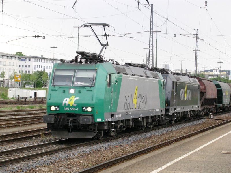 185 550-1 mit abgebügelter 185 572-5 von Rail-4-Chem müssen am 15.05.08 im Regensburger Hbf auf Freigabe der Strecke warten. (zum Bild)