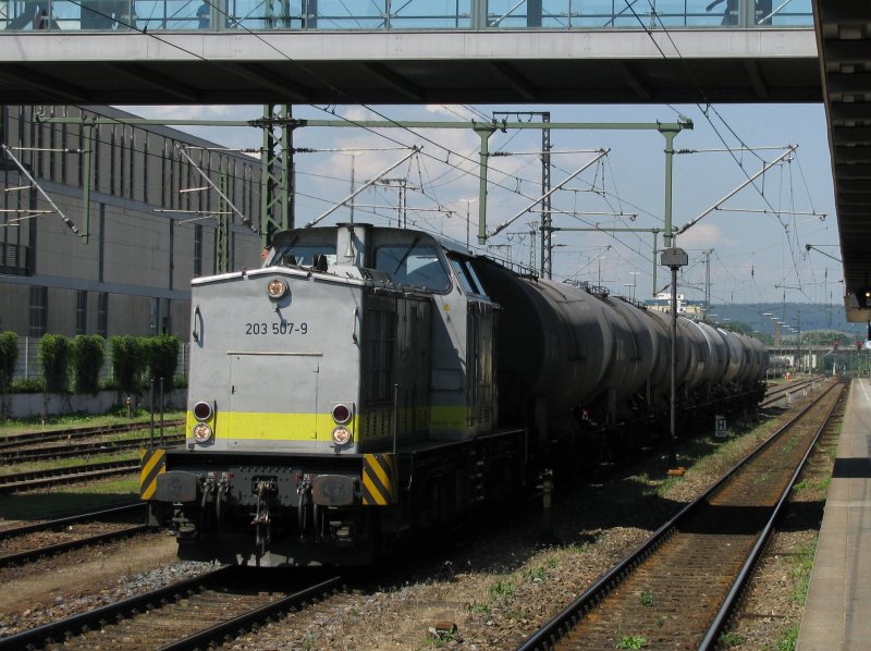 203 507 mit einem Kesselwagenzug am 10.6.2008 in Regensburg. Weiß jemand, welchen Unternehmen diese Lok gehört? (zum Bild)