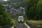 VT117 erreicht von Neuhaus am Rennsteig kommend den Bahnhof Lauscha. Aufgenommen vom Bahnübergang Alte Chaussee. Lauscha 02.08.2023 (zum Bild)