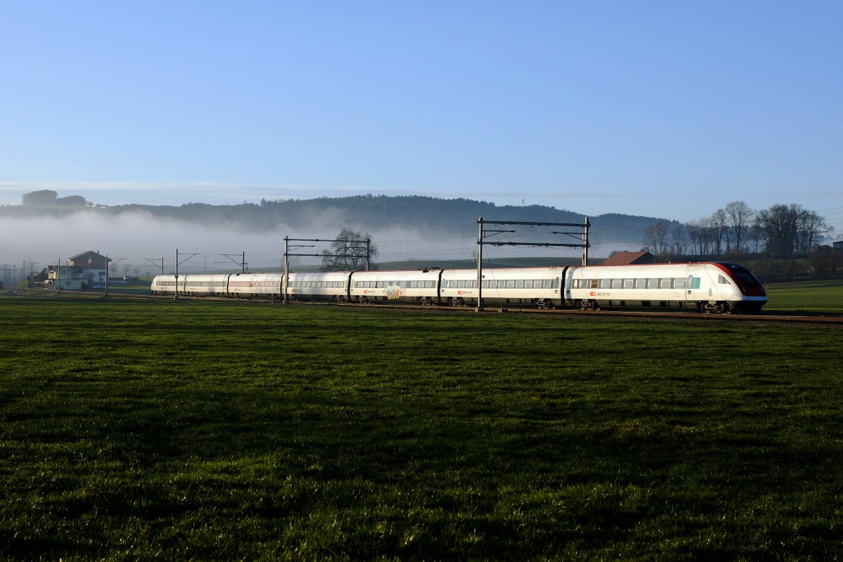 SBB: RABDe 500 (ICN) bei Egolzwil in Richtung Luzern unterwegs am 17. Dezember 2015. Der Zug befindet sich nur noch wenige Meter vor dem sonnigen Streckenabschnitt bei Wauwil entlang des grossen Sees. Foto: Walter Ruetsch (naar de afbeelding)