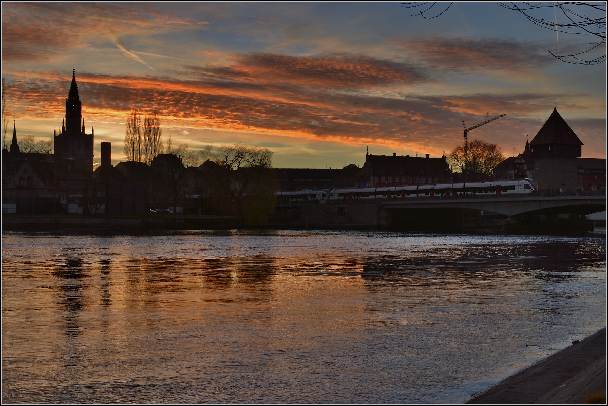 Vielfarbig leuchtet der Himmel und lässt seine farbigen Spuren auch im Dunklen walten, nur schwach schimmert der Seehas auf der Rheinbrücke. Konstanz, Dezember 2015. (naar de afbeelding)