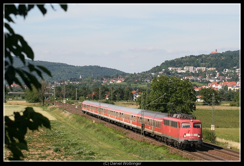 110 456 mit einem verkehrtherum gereihten RB auf der Main-Neckar-Bahn bei Großsachsen-Heddesheim, 17. Juni 2009. (zum Bild)