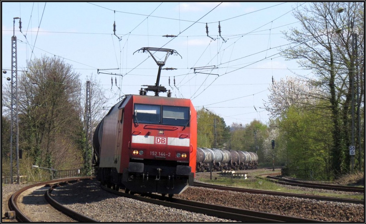 Die 152 144-2 legt sich mit ihren Kesselwagenzug in den Gleisbogen am Bahnhof von Eschweiler (Rhl) auf der Kbs 480.Szenario vom 18.April 2015 vom Bahnsteig aus. (zum Bild)