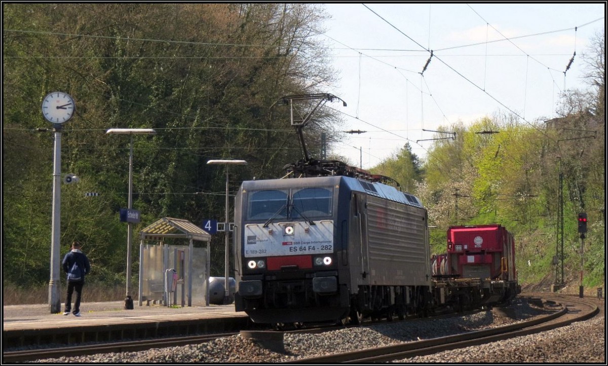 Die MRCE E189-282 fährt mit ihrer Güterfracht in Richtung Köln. Hier zu sehen bei der Durchfahrt am Bahnhof von Eschweiler (Rhl) am 18.April 2015. (zum Bild)