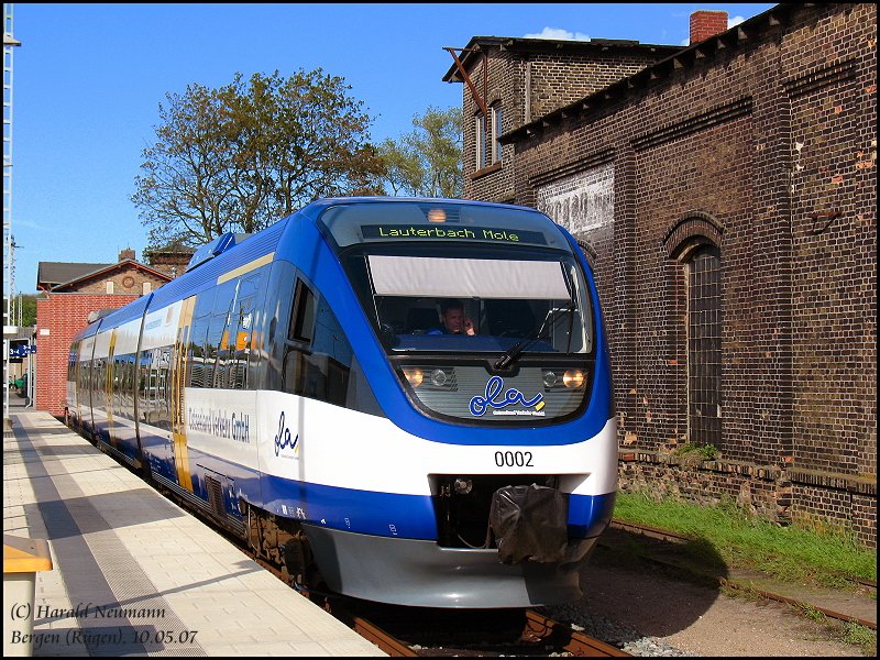 VT0002 der Ostseeland GmbH als OLA80115 am Gl.1 des Bahnhof Bergen auf Rügen. 10.05.07 (zum Bild)