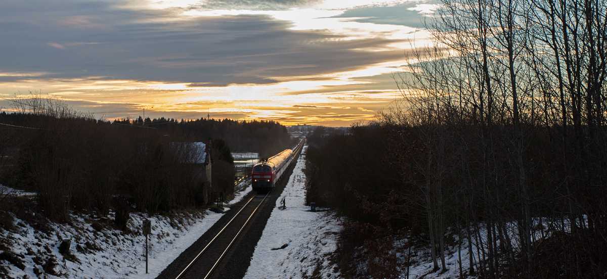 218 423-2 war am frühen Abend des 05.01.15 mit ihrem Bn-Wagenzug nach Mühldorf in Wimpasing, Nähe Ottenhofen, unterwegs. Im Hintergrund erkennt man die Kleinstadt Markt Schwaben. (zum Bild)