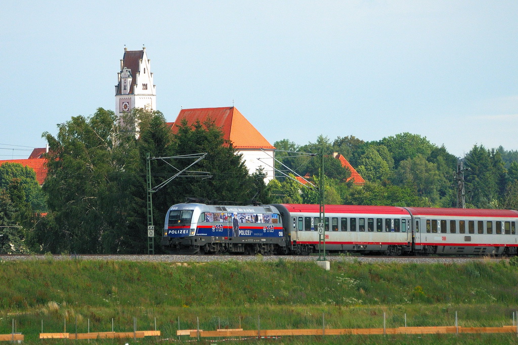 1116 250-0 "Polizei" auf Streife mit EC 112 (Klagenfurt - Siegen) im Mindeltal. Das heutige Motto: "Immer schön die Kirche im Dorf lassen..." (Scheppach, KBS 980, 21.06.2011). (alla foto)