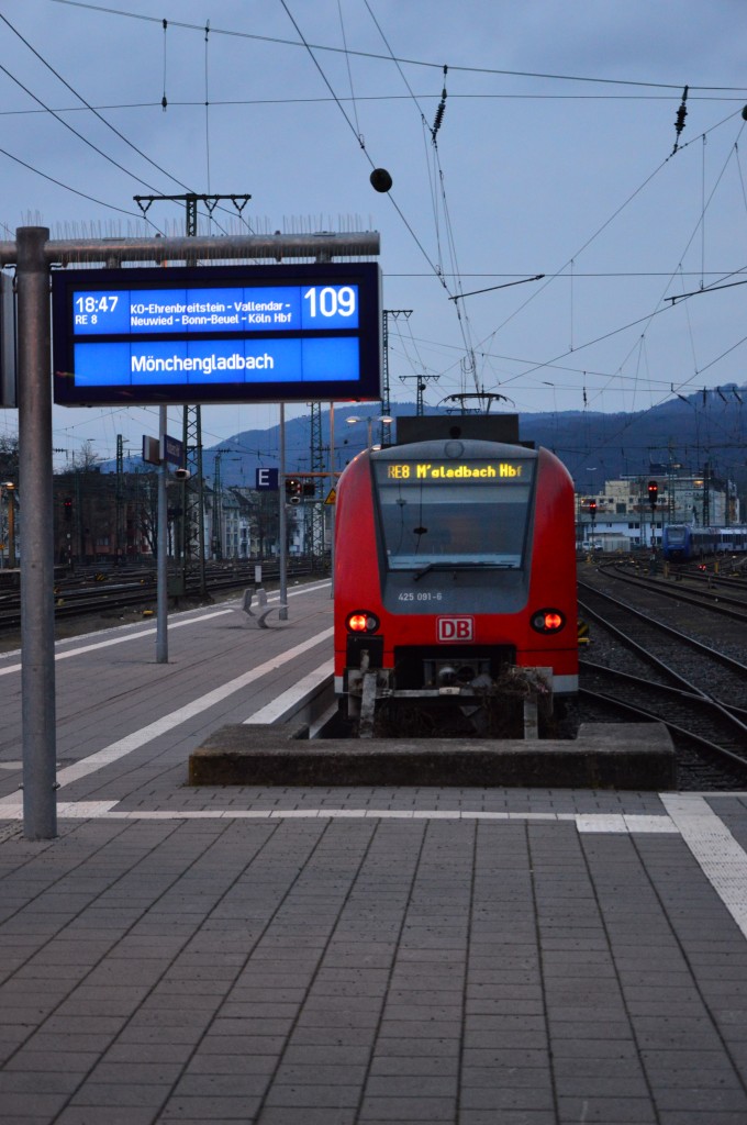 Anzeigetafel verrät wo der RE8 auf seinem Weg nach Mönchengladbach noch hält.....wenn er dann erst mal los fährt. 15.3.2015 (zum Bild)