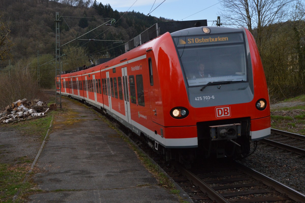 Einfahrt des 425 703-6 in Neckargerach am 30. März 2015, der Zug ist als S1 nach Osterburken unterwegs. (zum Bild)