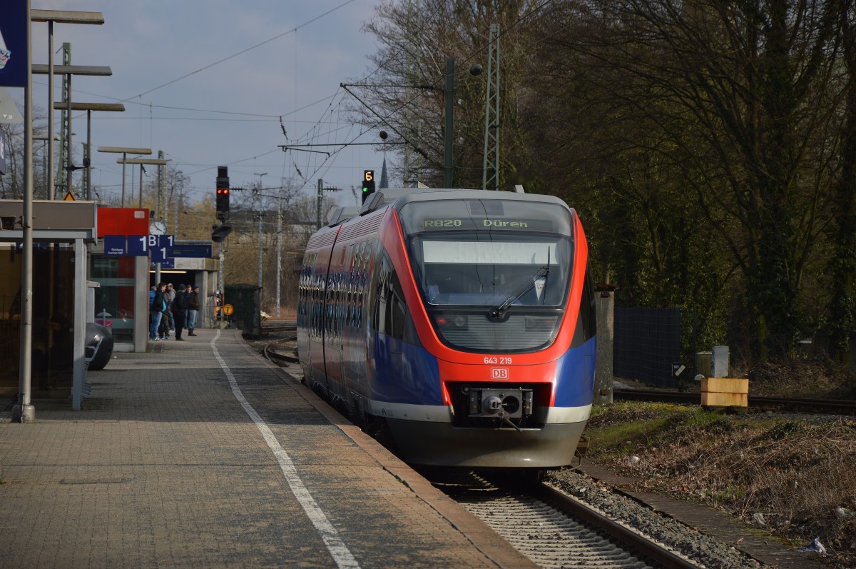 Gerade ist dieser RB20 Zug nach Düren in Aachen West eingefahren, nach kurzem Halt verlässt der 643 219 den Bahnsteig in Richtung Hbf.22.3.2015 (zum Bild)