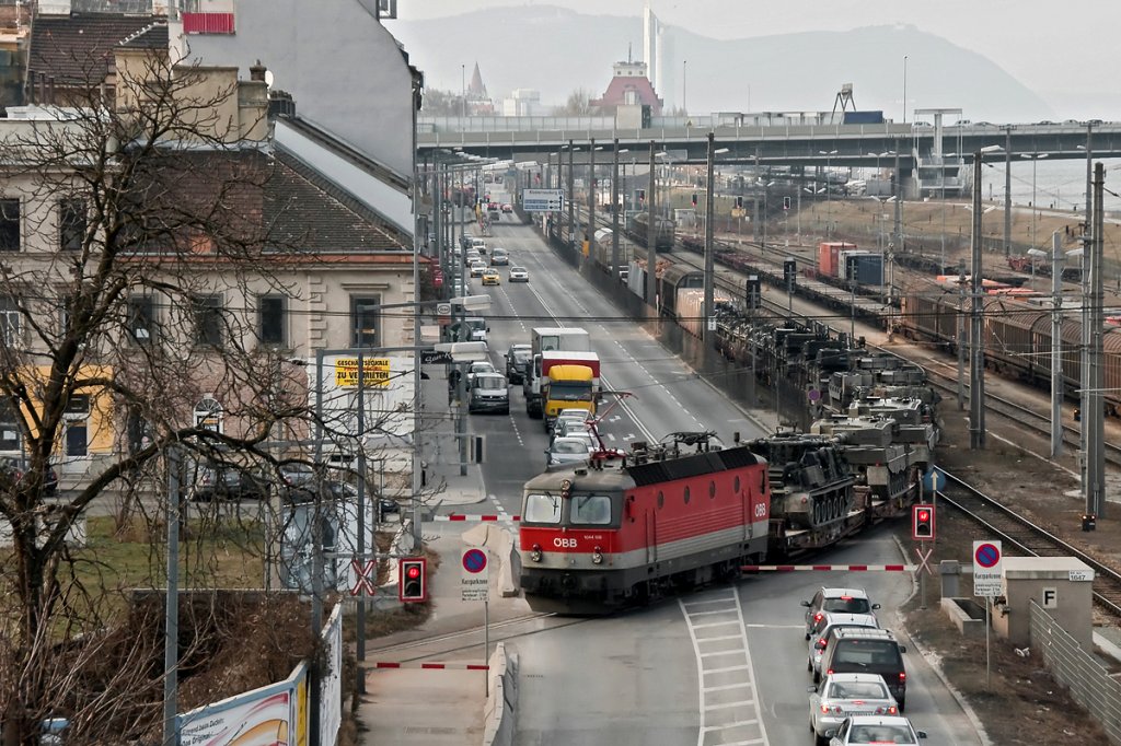 BR 1044 108 mit Zug 56013, beim Überqueren des Handelskai in Wien, am 25.02.2011. (zum Bild)