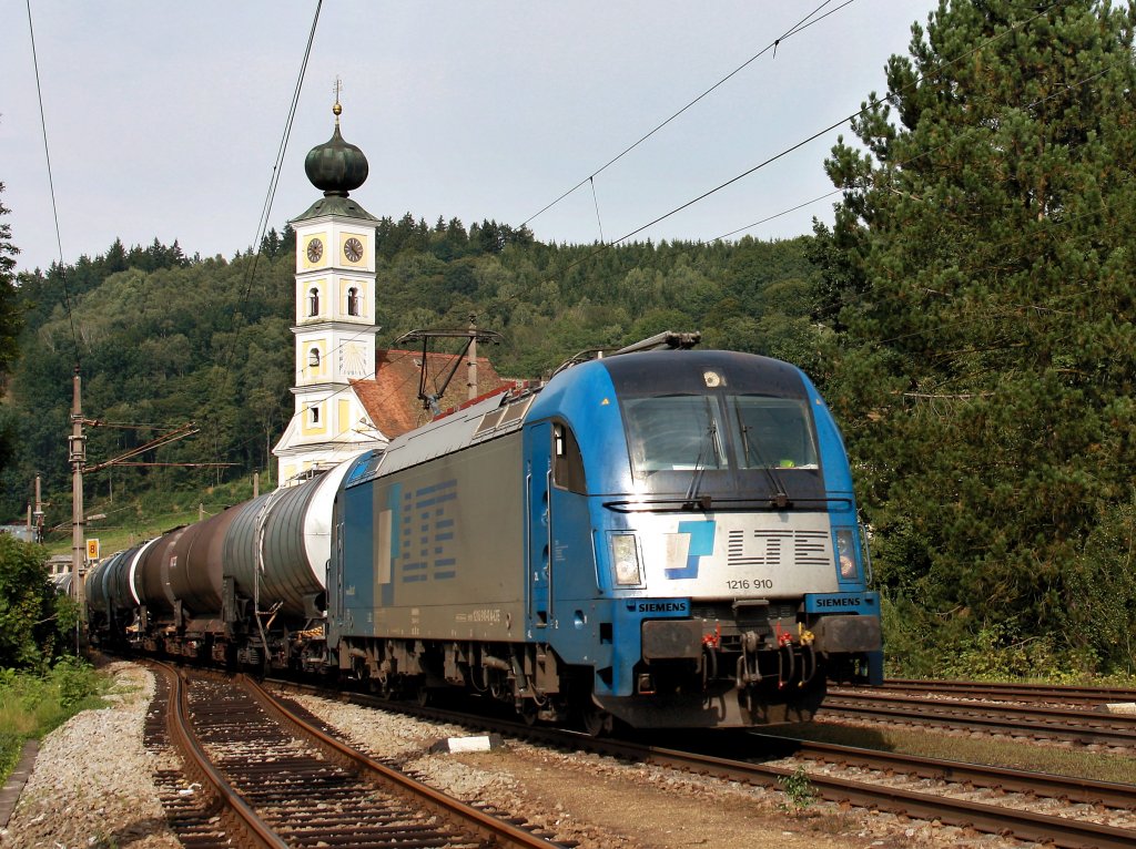 Die 1216 910 am 26.08.2009 mit einem Kesselwagenzug bei der Durchfahrt in Wernstein. (zum Bild)