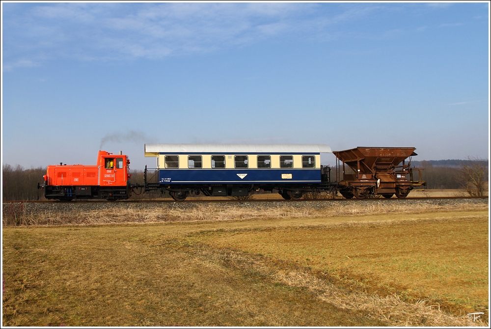 Dieselok 2060 14 fährt mit einem Foto-Gmp auf der FROWOS Strecke von Oberwart nach Oberschützen. Oberwart 26.02.2011 (zum Bild)