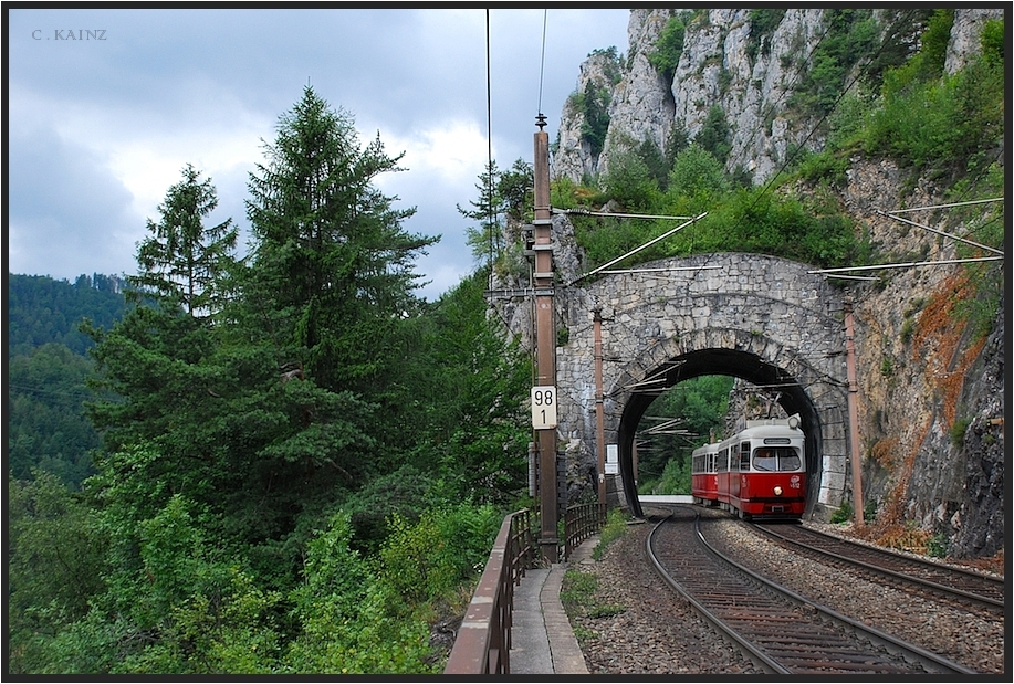 Mit der zum Fahrplanwechsel erfolgten massiven Ausdünnung des Regionalverkehrs auf der Semmeringbahn hat sich für die "Wiener Linien" ein unerwartetes, neues Betätigungsfeld eröffnet. Da die ÖBB die Bergstationen jetzt nurmehr im 2-3 Stunden, statt wie bisher im Stundentakt, und tagsüber bis auf eine nachmittägl. Verbindung nach Mürzzuschlag nurmehr bis Bf. Semmering bedient, und die Vmax auf der Bergstrecke zum Teil ohnehin nur 50km/h beträgt, fahren die "Wiener Linien" nun unter dem Motto " Von der Oper zur Rax " mit für den 15 Kv Betrieb eigens umgerüsteten Zweifrequenz Durchbinder - Zügen von der Wiener Ringstrasse bis nach Mürzzuschlag. Diesem innovativen Strassenbahnbetrieb, gingen bereits im Sommer des Vorjahres umfangreiche Probefahrten voraus, wo ich einen der Versuchszüge bei der Fahrt durch den legendären 14m langen Krauseltunnel fotografieren konnte ... (naar de afbeelding)