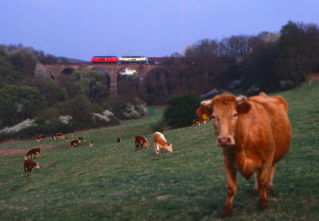 Zwei unidentifizierte 216 befahren den Viadukt von Nieder Erbach mit Tonerdezug 67400, 30.04.1996. (naar de afbeelding)