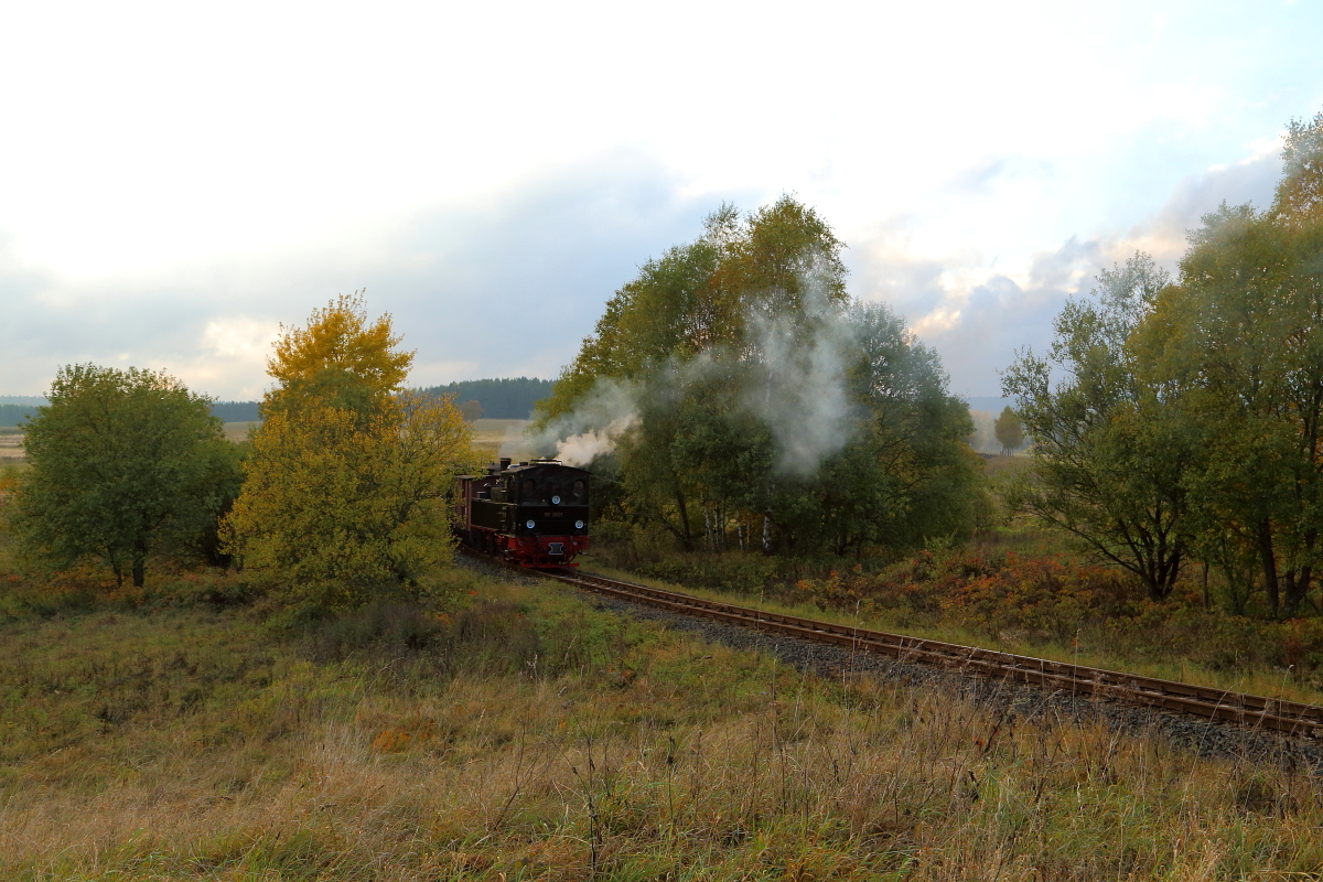 99 6001 mit Foto-Güterzug am 23.10.2016, kurz vor Erreichen des Haltepunktes Sternhaus-Ramberg. Hier wird sie den im Haltepunkt wartenden Personenzug überholen, welcher dann im Blockabstand folgt. In Alexisbad sieht man sich dann wieder. Das Ganze erfolgt im Rahmen einer Sonderzugveranstaltung der IG HSB. Auch dieser Fotostandort ist übrigens eine Idee unseres Reiseleiters Herrn Winfried Schwarzbach, für dessen langjährigen Einsatz bei den Planungen der Sonderfahrten und unermüdliches Engagement, sowohl für die Bahn selbst, als auch deren Fahrgäste, ich mich hier an dieser Stelle einmal ganz herzlich bedanken möchte! Er ist jedesmal mit dem Herzen bei der Sache, sucht die schönsten Fotostandorte aus und weiß auch unendlich viel über die Bahn und ihr Umfeld zu erzählen. Das ist ein wesentlicher Grund dafür, warum auch ich immer wieder gern an den HSB-Sonderzugveranstaltungen teilnehme. (zum Bild)