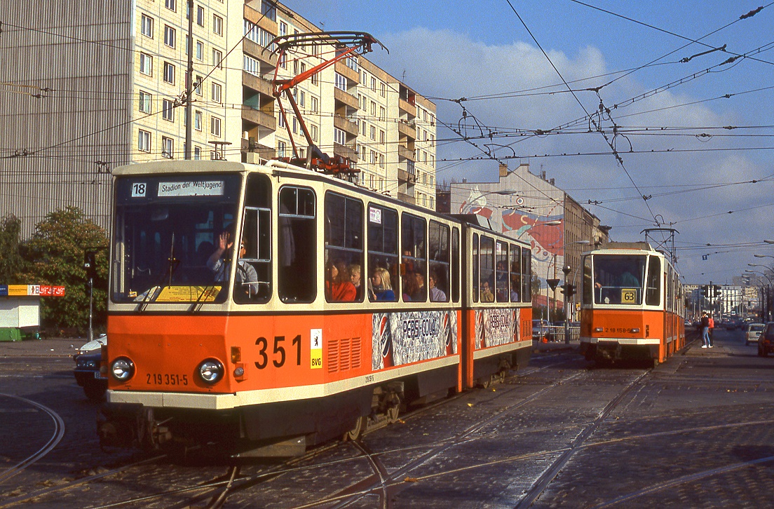 wieder ein sehr schönes und interessantes Straßenbahnbild, diesmal vom einem Berliner KT4D aus der Zeit, als die Berliner Straßenbahnfahrzeuge zwar auf die BVG übergegangen waren, aber noch die Farben der BVB hatten.