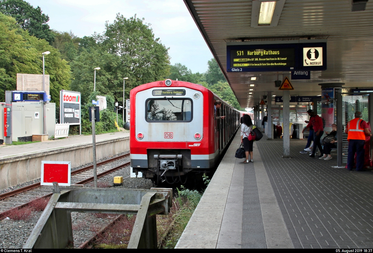 Zwei 472 der S-Bahn Hamburg als S31 nach Hamburg-Harburg Rathaus stehen in ihrem Startbahnhof Pinneberg auf Gleis 2. [5.8.2019 | 18:37 Uhr] (zum Bild)