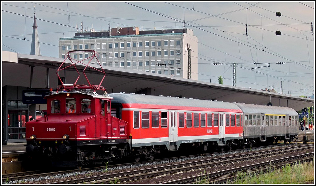 Zur 10 Jahresfeier des DB Museums Koblenz wurden am 22.05.2011 Rundfahrten mit der E 69 03 angeboten. Hier durchfährt sie den Hauptbahnhof von Koblenz. (Jeanny) (zum Bild)