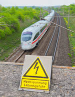 Hochspannung - Lebensgefahr! Mit einem ICE 2 bei Markt Einersheim, der Richtung Nürnberg untwegs ist, 02.05.2019 (zum Bild)