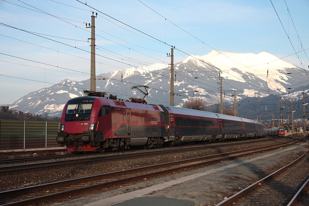 1116 217 mit einem railjet bei Durchf. Bf Fritzens-Wattens am 17.03.2010. Schade das die blutorange Farbgebung der ÖBB-Züge nicht mehr aktuell ist, das Bild würde auch bei niedrig stehender Sonne wesentlich freundlicher wirken. (zum Bild)