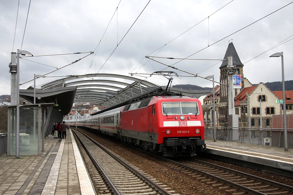 120 143 schiebt am 26.03.2009 den IC73927 aus dem Bf Jena-Paradies. (zum Bild)