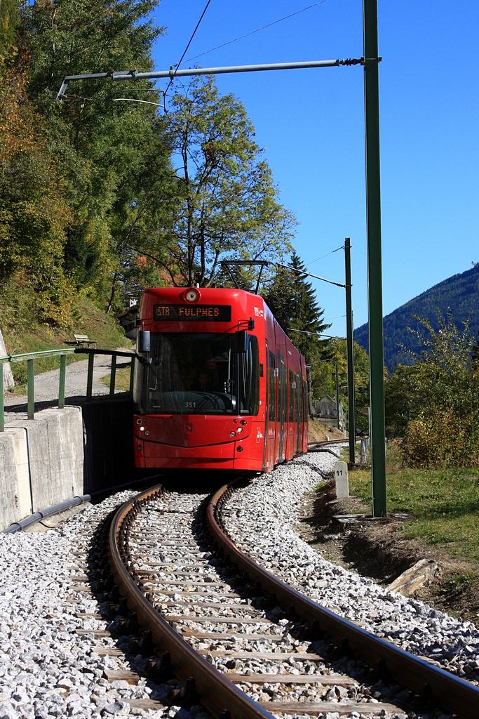 Am 18.10.2011 ist IVB 351 unterwegs nach Fulpmes, auf der Stubaitalbahn bei Kreith. (zum Bild)
