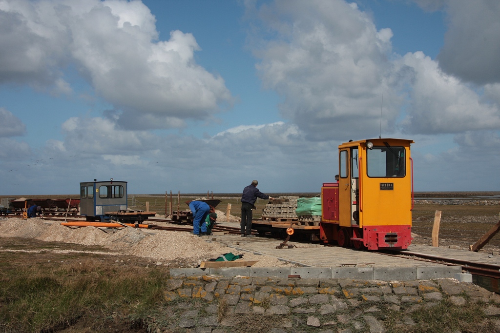 Baustelle vor der Neuwarft auf Hallig Nordstrandischmoor am 21.04.2010 mit der gelben Schöma (Bj 1998) und der Lore 1. Das Gelände der Ausweiche vor der Neuwarft wurde damals mit Hilfe von altbarauchbarem Pflaster befestigt, man könnte fast behaupten, zum Bf ausgebaut. (Halligbahn Lüttmoorsiel - Nordstrandischmoor) (zum Bild)