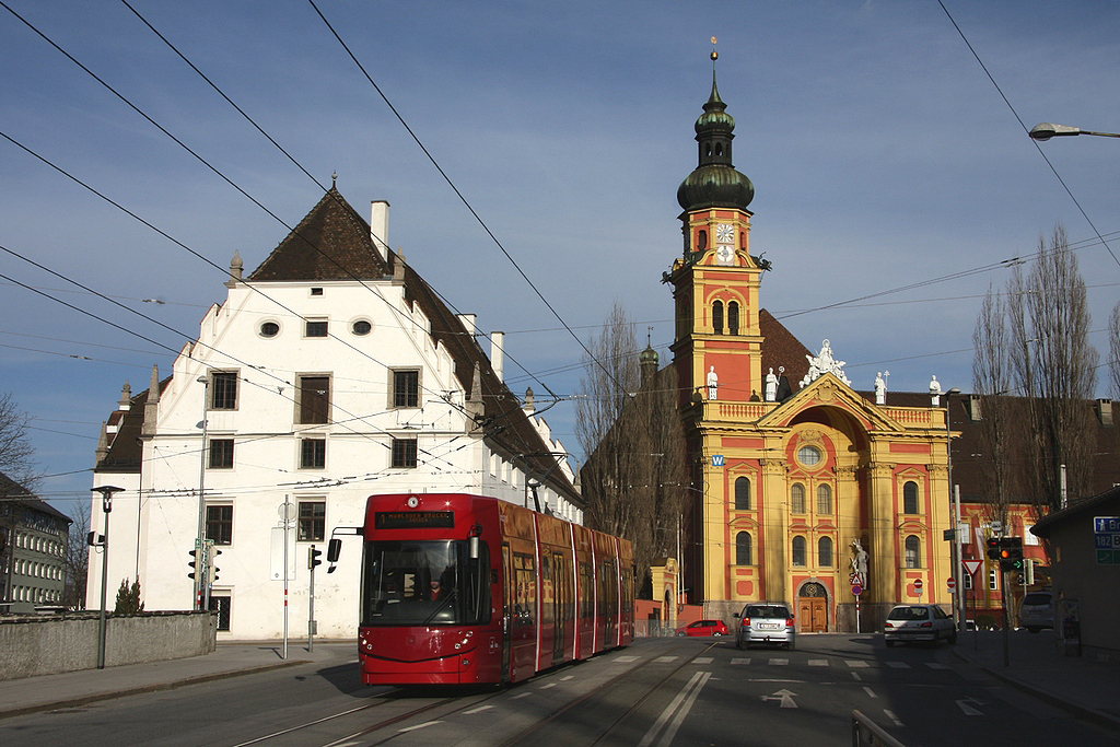 Innsbruck - IVB/Linie 1 - 354 kommt am 18.03.2009 von der Endhaltestelle Bergisel und wird gleich die Hst. Stubaitalbahnhof erreichen. Im Hintergrund das Stift Wilthen. (zum Bild)