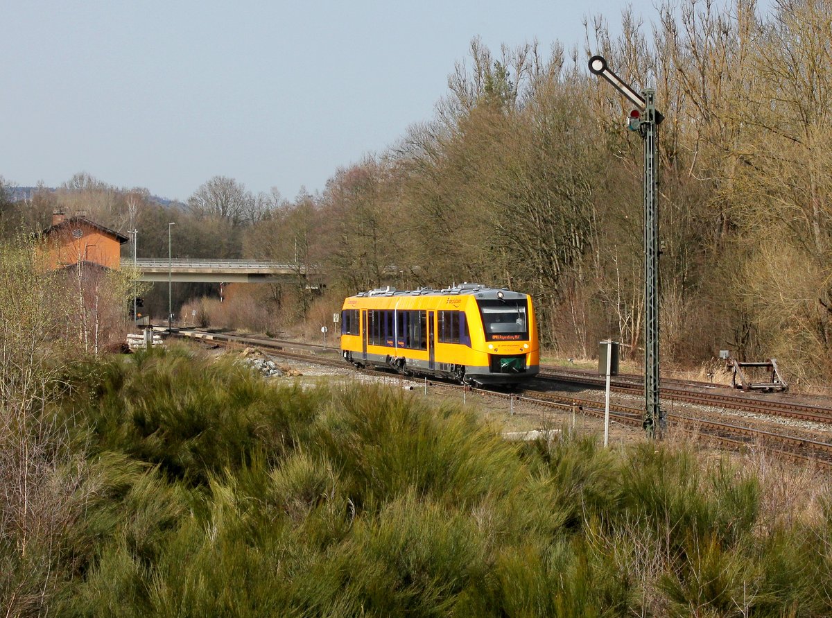 Der 1648 203 als OPB nach Regensburg am 02.04.2016 bei der Ausfahrt aus Reuth b. Erbendorf. (zum Bild)