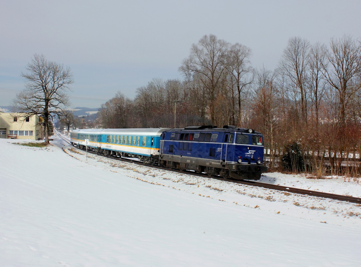 Die 2143 018 mit einem ALEX nach Oberstdorf am 27.02.2016 unterwegs bei Immenstadt (zum Bild)