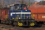 Da der Bahnübergang und der Bahnhof in Burbach (Kreis Siegen) dicht beieinander liegen, so muss die Lok 42 (eine MaK 1700 BB) der KSW (Kreisbahn Siegen-Wittgenstein) ihre Res-Wagen über den Bü hinaus rangieren. (Burbach/Siegerland am 18.03.2013) (naar de afbeelding)