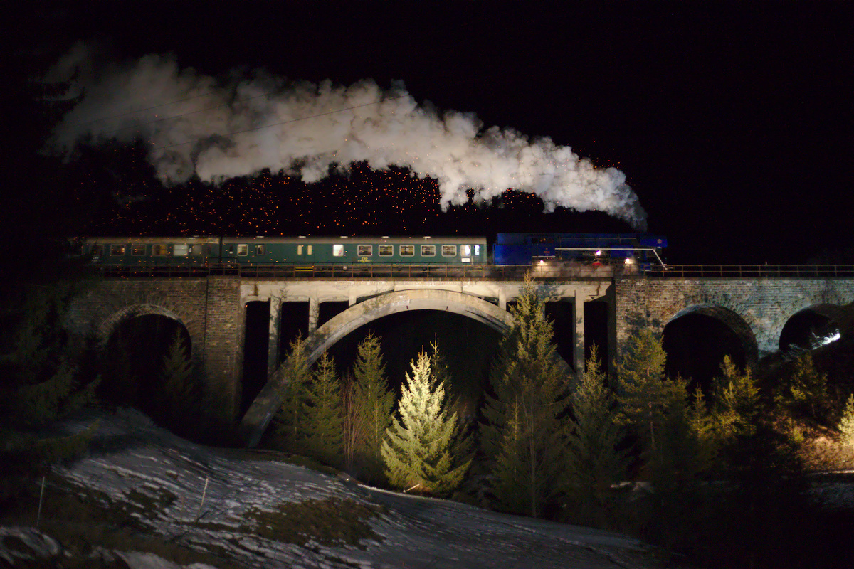 ganz toll hingekriegt, das Nachtbild mit Dampfzug!