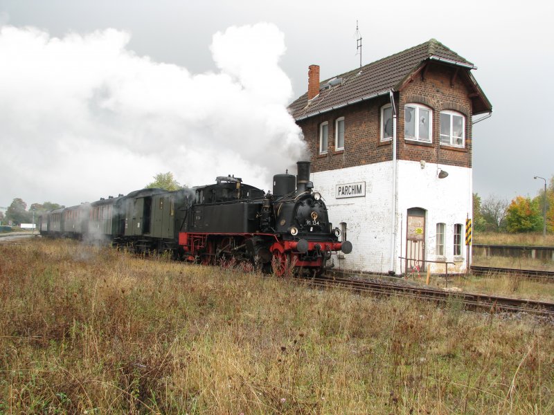 Dampflok 91134 beim Bereitstellen des letzten Sonderzuges am 11.10.2009 im Bahnhof von Parchim. (alla foto)