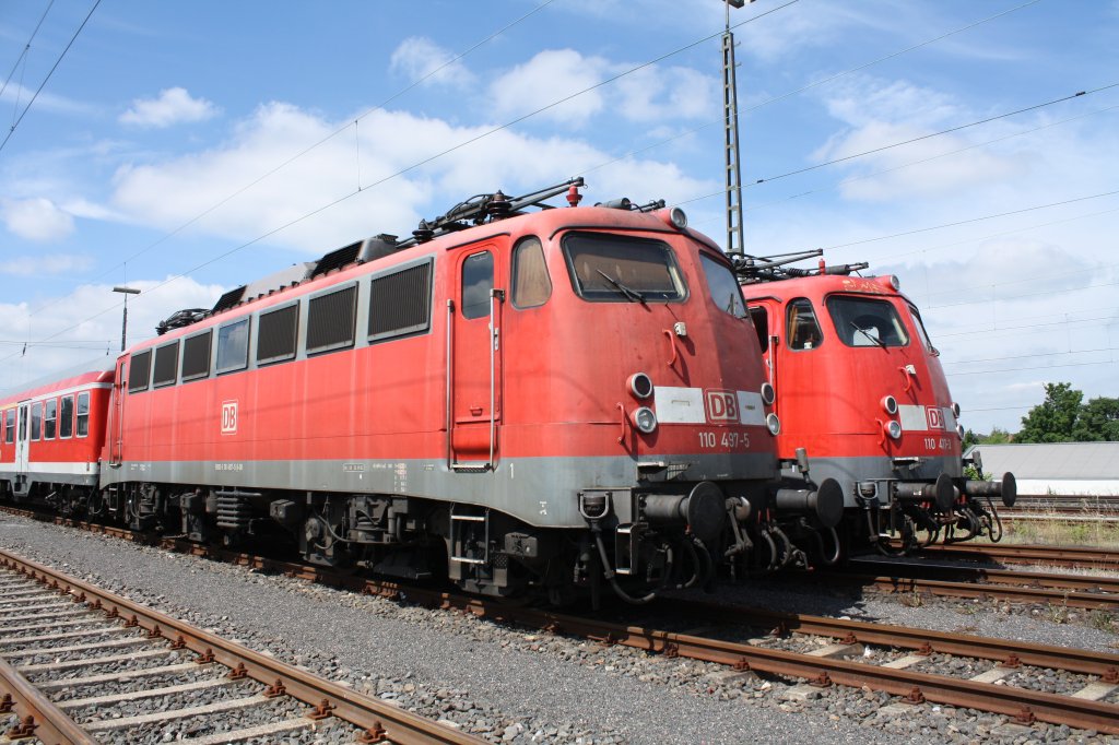 110 497-5 und 110 417-3 Halten am 13.6.10 mit Vorihnen stehenden Schwestern 110 457, 110 494, 110 415 in Aachen Rothe Erde ihre Sonntagsruhe (zum Bild)