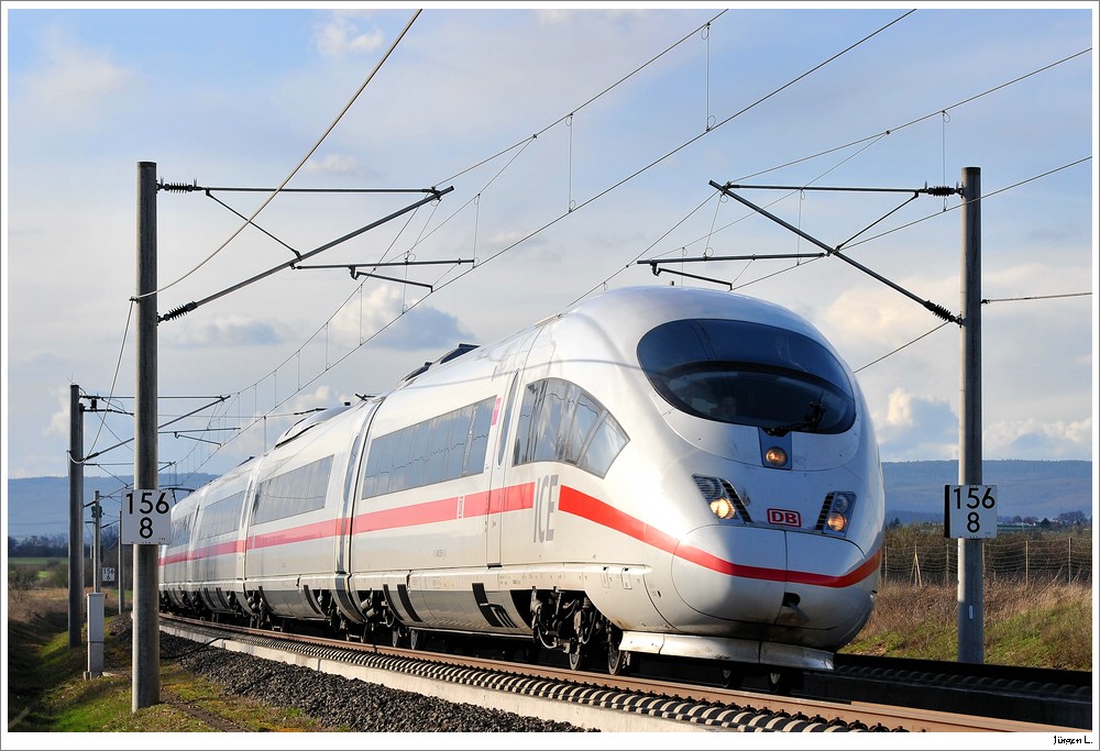 Und hier steht der schnelle Zug im Vordergrund, gerade, weil neben dem Zug auch ein Spalt flache Landschaft zu sehen ist und die Fahrleitungsmaste ein wenig Bahnambiente vermittelen.