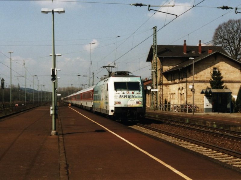 101 080-0 mit IC-zug auf Bahnhof Hasbergen am 23-4-2001. Bild und scan: Date Jan de Vries. (zum Bild)