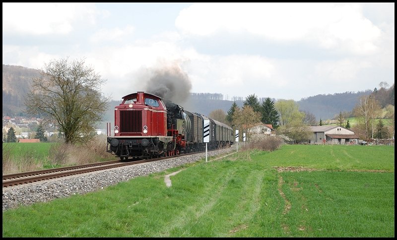 212 084 zieht die 64 419 und den DLr 92865 von Crailsheim nach Aulendorf. Aufgenommen am 26.April 2008 bei Oberkochen. (zum Bild)