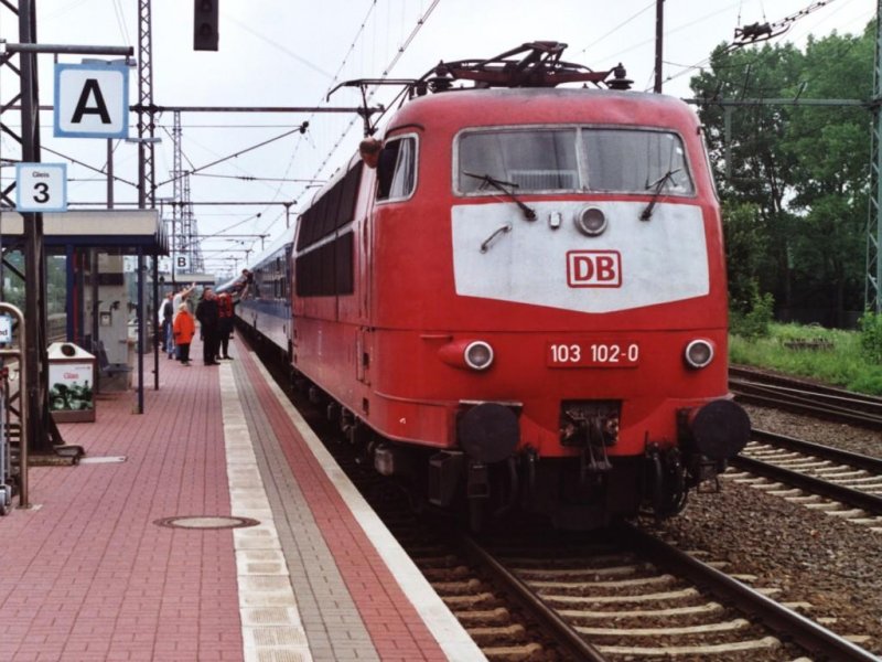 Auf Wiedersehen. 103 102-0 und ihre IR 2345 Wesertal Amersfoort-Berlin Ostbahnhof fahrt jetzt ab. Eine Aufnahme auf Bahnhof Bad Bentheim am 21-5-2000. Bild und scan: Date Jan de Vries. (zum Bild)