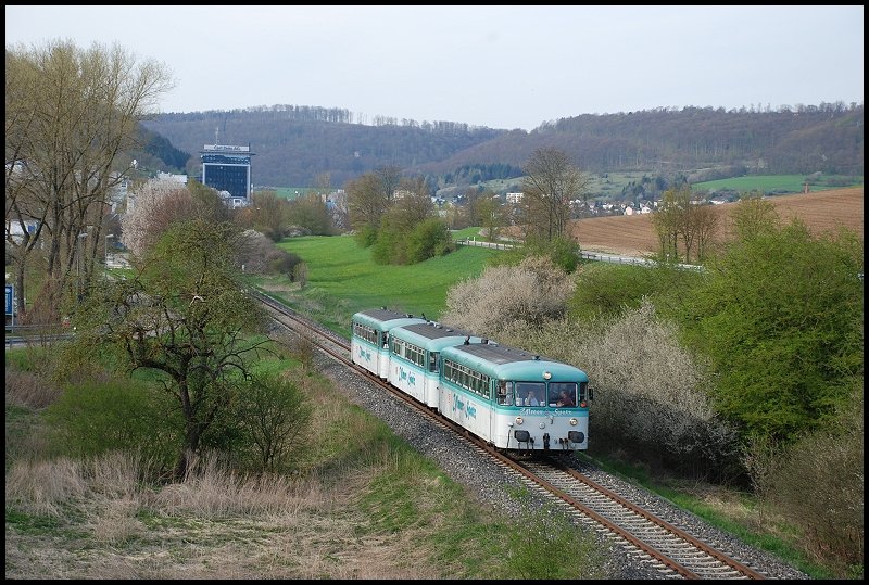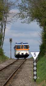 VT 26 kurz vor dem Siegelsbacher Bahnhof. Noch den Buckel runter, noch ne Kurve und dann ist er schon im Bahnhof. (zum Bild)