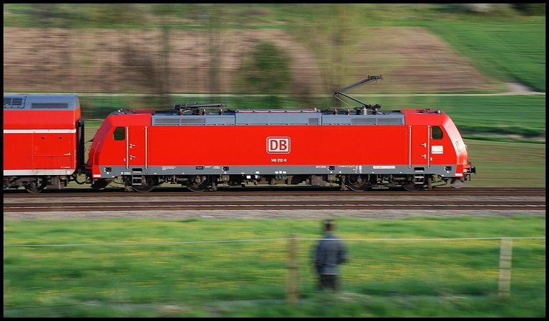 Mitzieher der 146 212. Sie wird während ihrer hohen Geschwindikeit von einem interessierten Mann betrachtet. Aufgenommen am 01.Mai 2008 bei Urspring. (zum Bild)