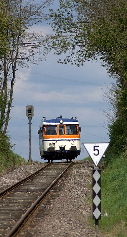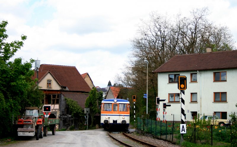 Obergimpern - Nebenbahnatmosphäre pur: Ein kleines Dorf, ein alter Traktor, ein alter Mercedes und mittendrin ein alter Triebwagen, der gerade in vielen Kurven den kleinen Ort durchfährt. MAN VT 26 als SWE 70773 nach Hüffenhardt kurz vor dem Erreichen des Haltepunktes von Obergimpern, 02.05.08. (zum Bild)