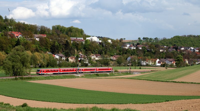 Währed ein Bauer mit seinem Traktor sein Feld befährt, ein Motoradfahrer durchs Land schleicht, fährt eine 110er mit ihrer Regionalbahn nach Aalen. Aufgenommen am 03.Mai 2008 bei Goldshöfe. (zum Bild)