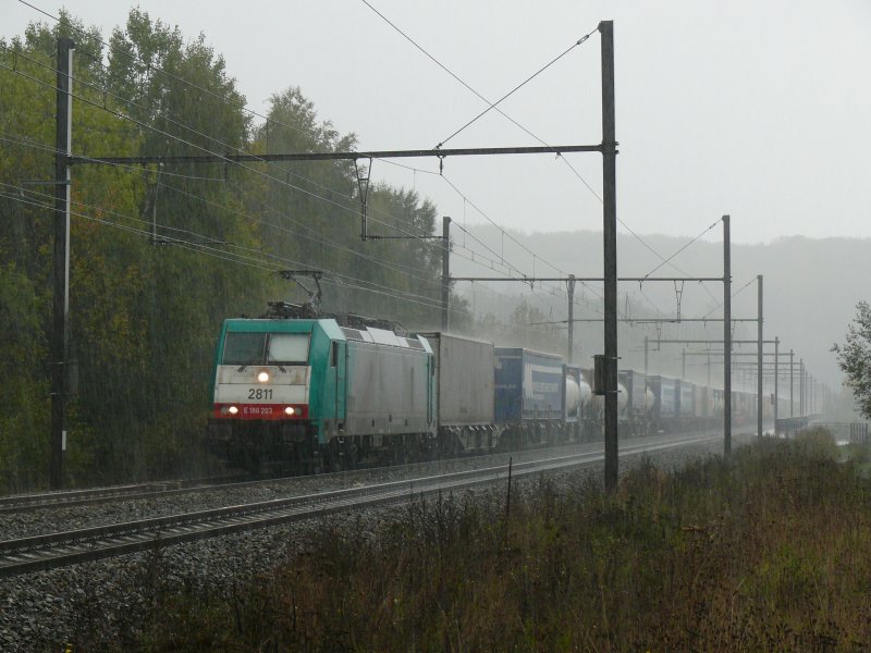 Man kann nicht immer nur Schönwetterfotos machen. In der Linken der Schirm, in der Rechten der Fotoapparat. Frage mich nur, was sich der Tf der 2811 gesagt hat, als er mich so ausgerüstet im strömenden Regen gesehen hat. Die Aufnahme entstand am 11/10/2009 in Remersdael. (do obrazu)