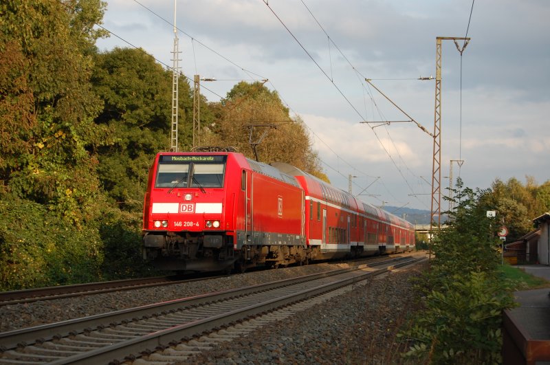 Nachdem mir 146 208-4 vor einer Woche schon vor die Linse gefahren ist, konnte ich sie am 2.10.2009 erneut auf der Filsbahn ablichten. Diesmal jedoch kurz vor Göppingen. (do obrazu)