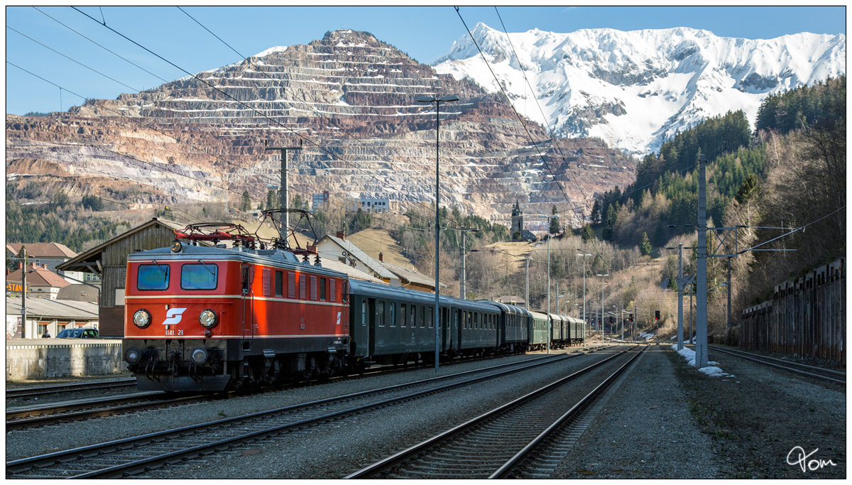 1141.21 mit dem "Sonderzug durch das Gesäuse" von Eisenerz nach Ampflwang. Eisenerz Bahnhof 30.3.2019 (zum Bild)