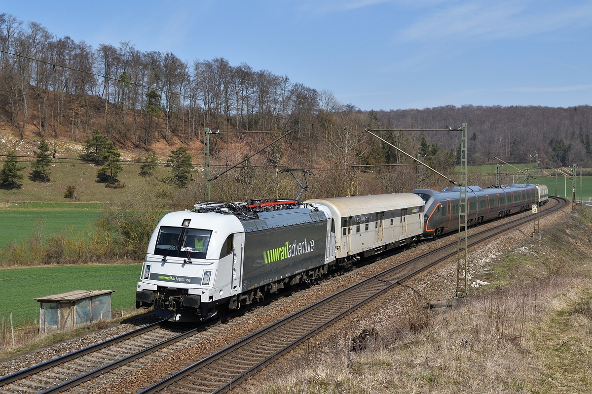 183 500 von Railadventure führte am 30. März 2019 mit einem CAF Flytoget Type 78 Messfahrten auf der Geislinger Steige durch. Das Bild zeigt den Zug bei Urspring. (zum Bild)