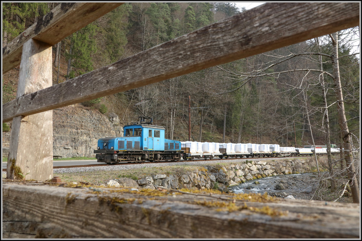 Der Breitenau Bach begleitet die Bahn durch den Roßgraben wie auch die L104 , die Brucker Landesstraße. Hier eine der unzähligen Brücken und Stege über den "wilden" Bach. 3.04.2019 (zum Bild)