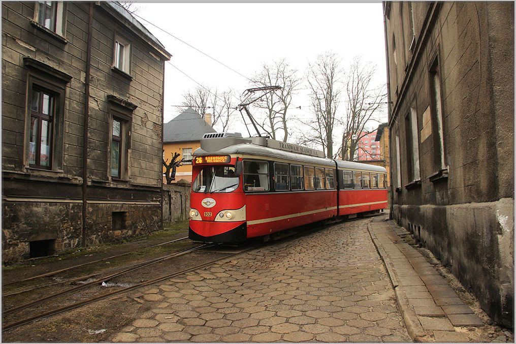 Ein E1 auf der Linie 26 in Myslowice. März 2018 (zum Bild)